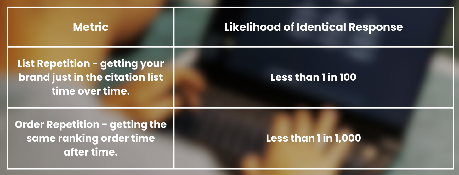 The likelihood of AI producing an identical brand list or ranking order across repeated queries is negligible.
